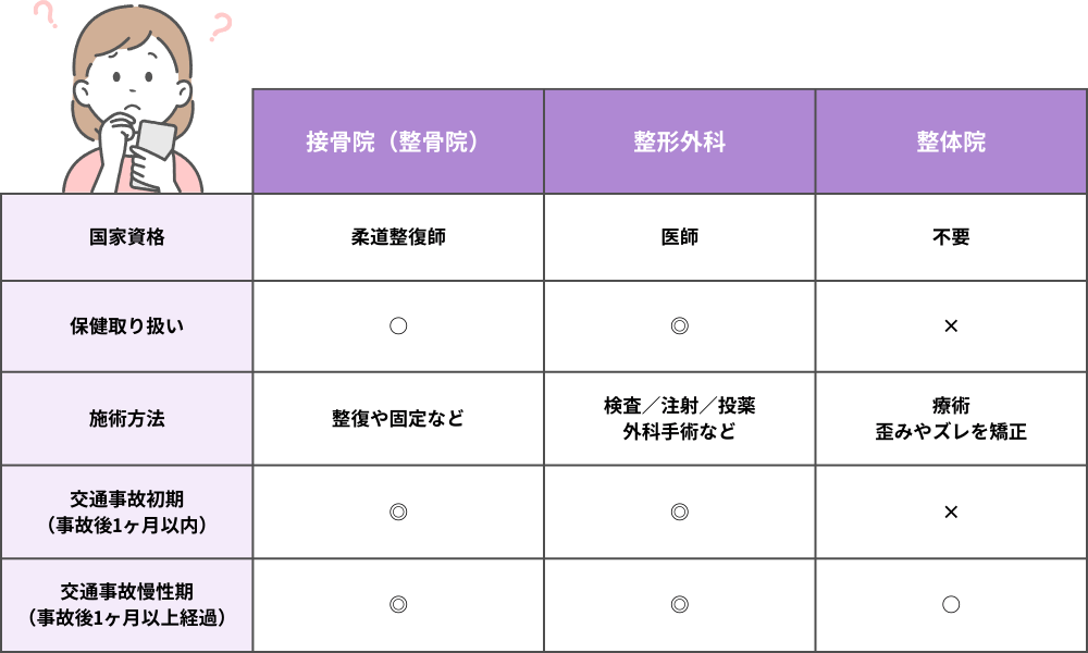 交通事故によるケガに対して、整形外科と整骨院を併用することができます。
