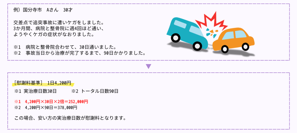 変わります。自賠責保険の慰謝料は、日数に4,300円を掛けて計算します。